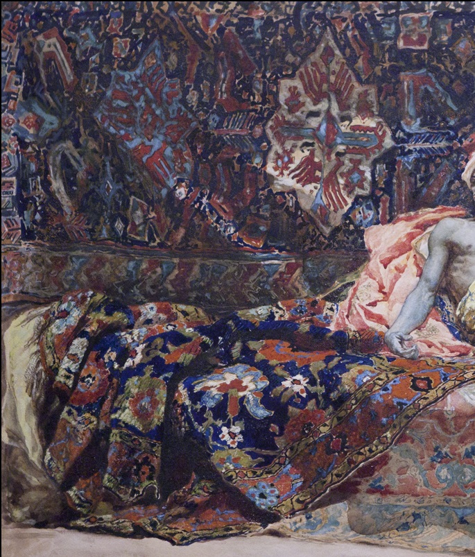 The doctor tightened the cloth around her arm until the flow of blood slowed to a few drops, which fell into the basin one by one, and fed a recurring pattern of concentric ripples that contrasted memorably with the vivid blue arabesques surrounding us. The odalisque, though still conscious, was drained of force, and stared up at the summit of the beautiful domed ceiling with unseeing eyes, her motionless, open lips emitting desultory moans.