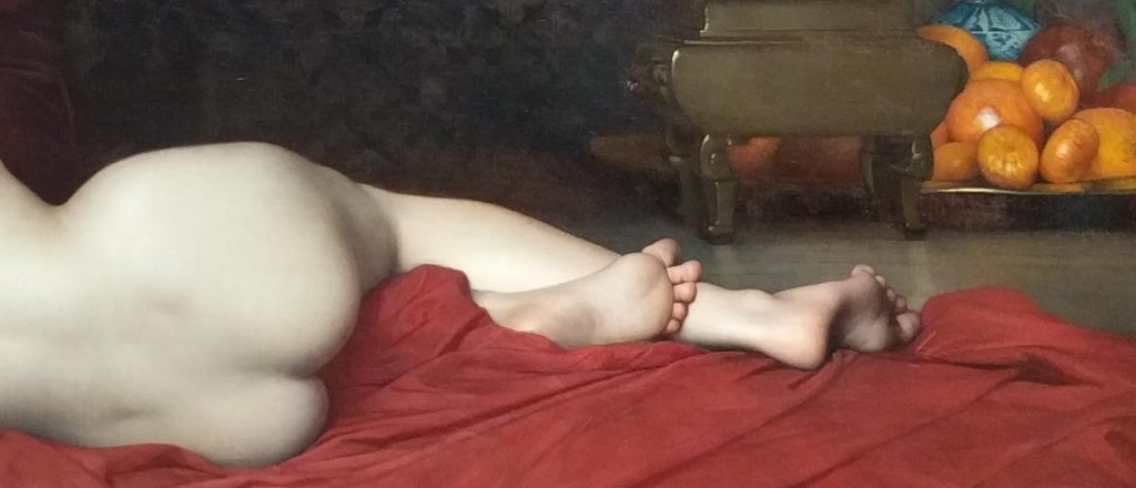 Everyone else crowded around the odalisque’s legs, and to see the procedure I was obliged to stand a few paces behind her head. My perspective foreshortened her breasts, belly, and thighs; beyond them the doctor stood between her spread feet, brandishing the hot irons. A voluminous mess of red hair obscured her features.